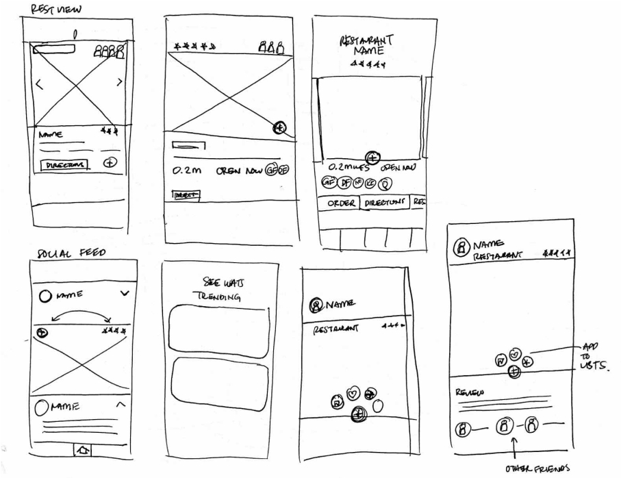 To kick-off the design process, quick sketches helped me get ideas on paper to establish which elements were necessary for each screen. A low fidelity prototype was then created for initial user testing.