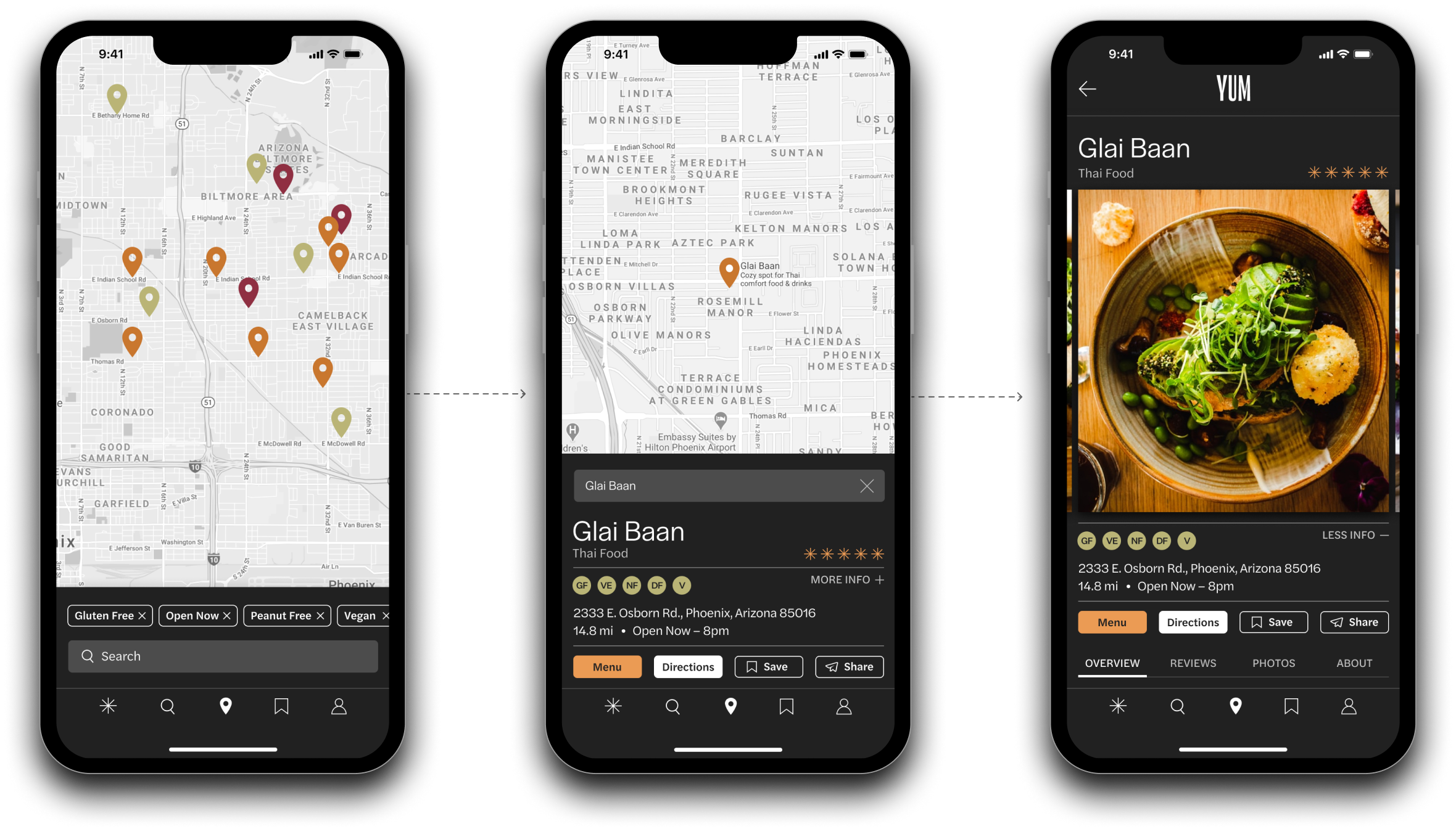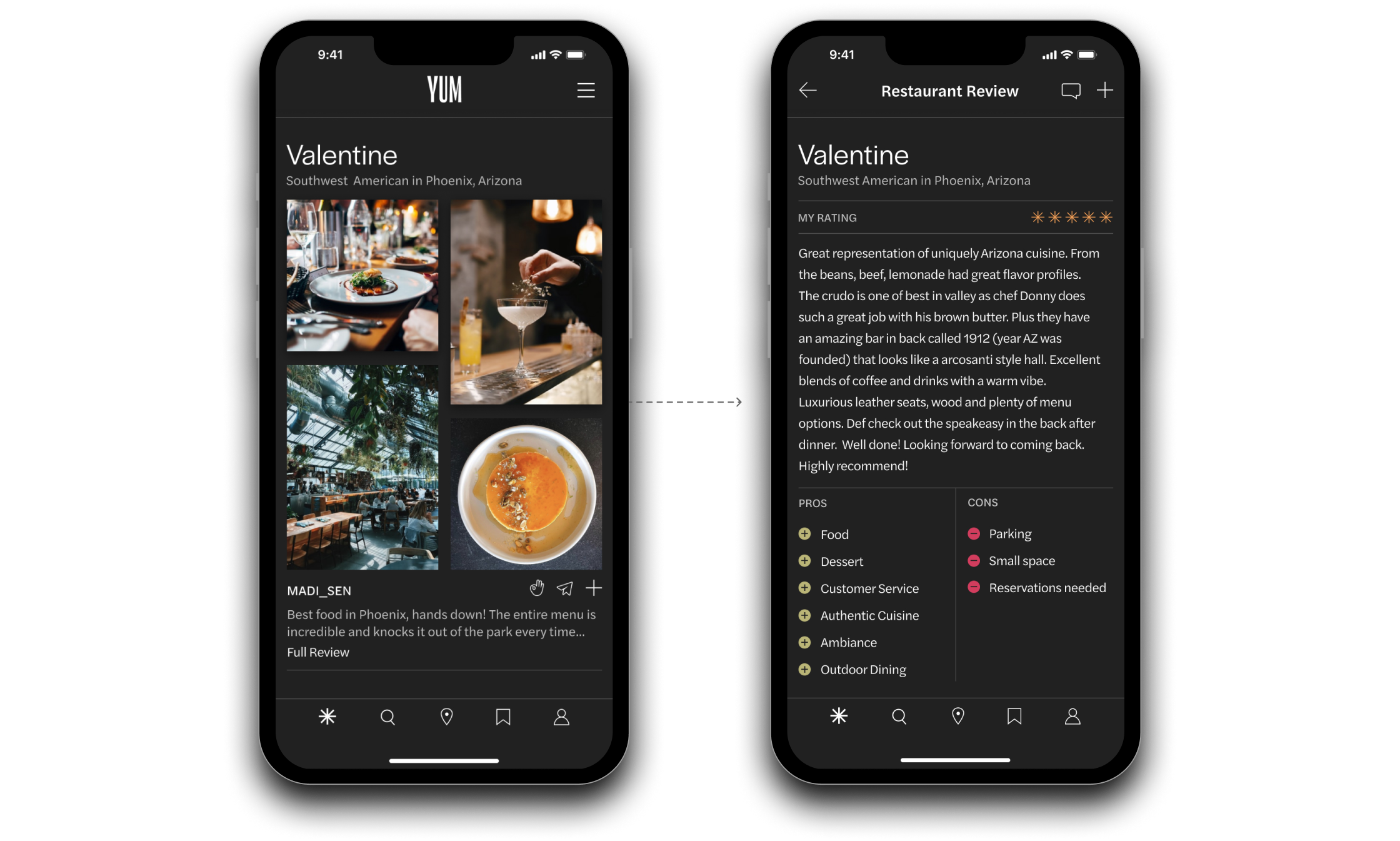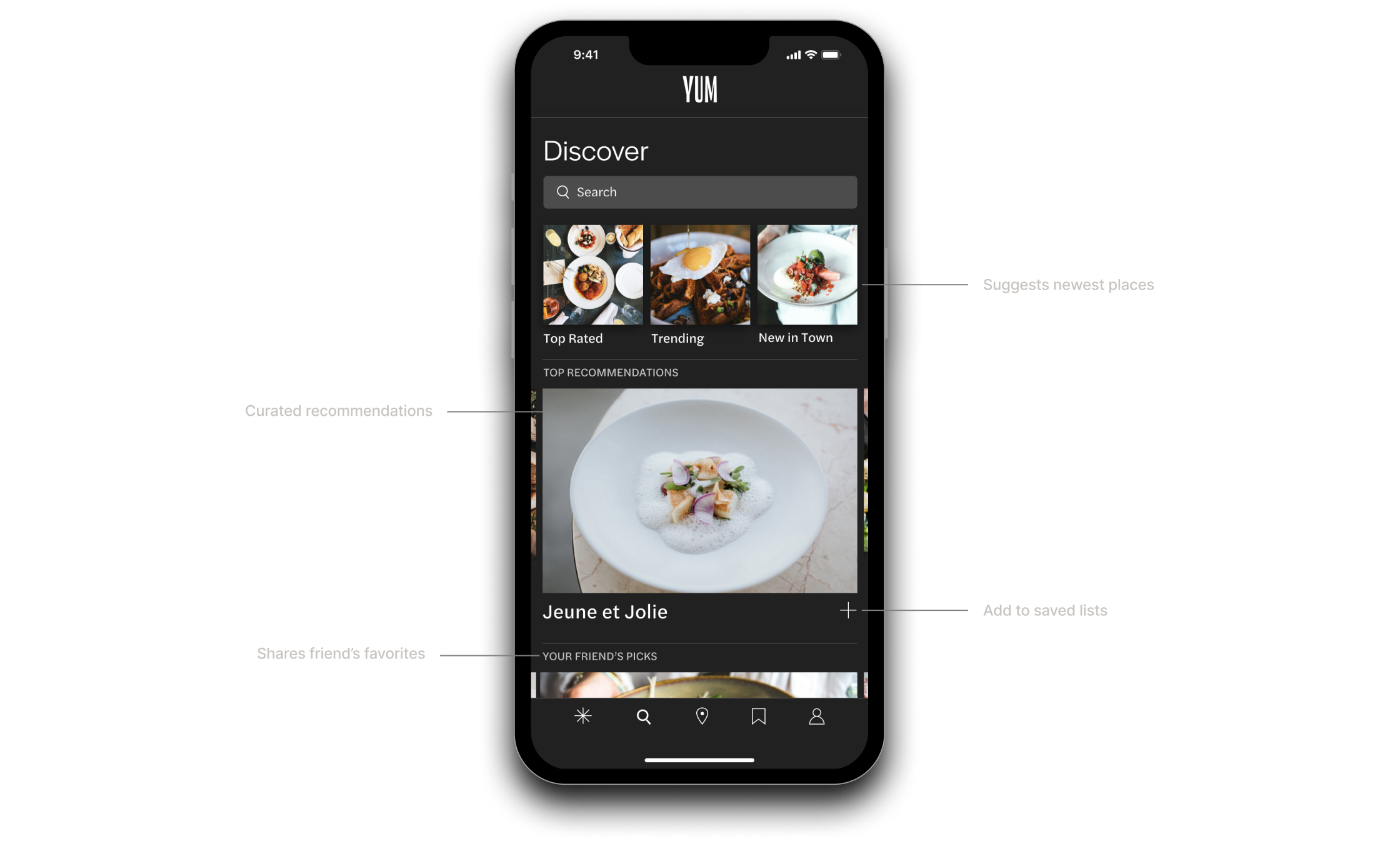 YUM integrates and improves upon the most used features of competing products to solve user pain points. Simplifying the process of finding reputable and desirable restaurant options, saving those new finds for future reference, and sharing them with friends.